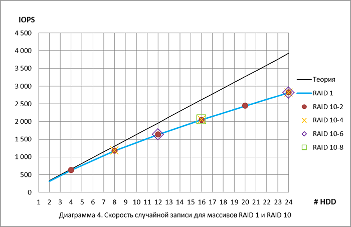 Сначала мы измерили скорость последовательного чтения и записи одного диска. В идеальной дисковой подсистеме при объединении нескольких дисков в массив RAID 0 скорость записи и чтения для массива должна быть равна произведению скорости одного диска на количество дисков в массиве. Производительность такого "идеального" массива показана на диаграммах прямой "Теория".